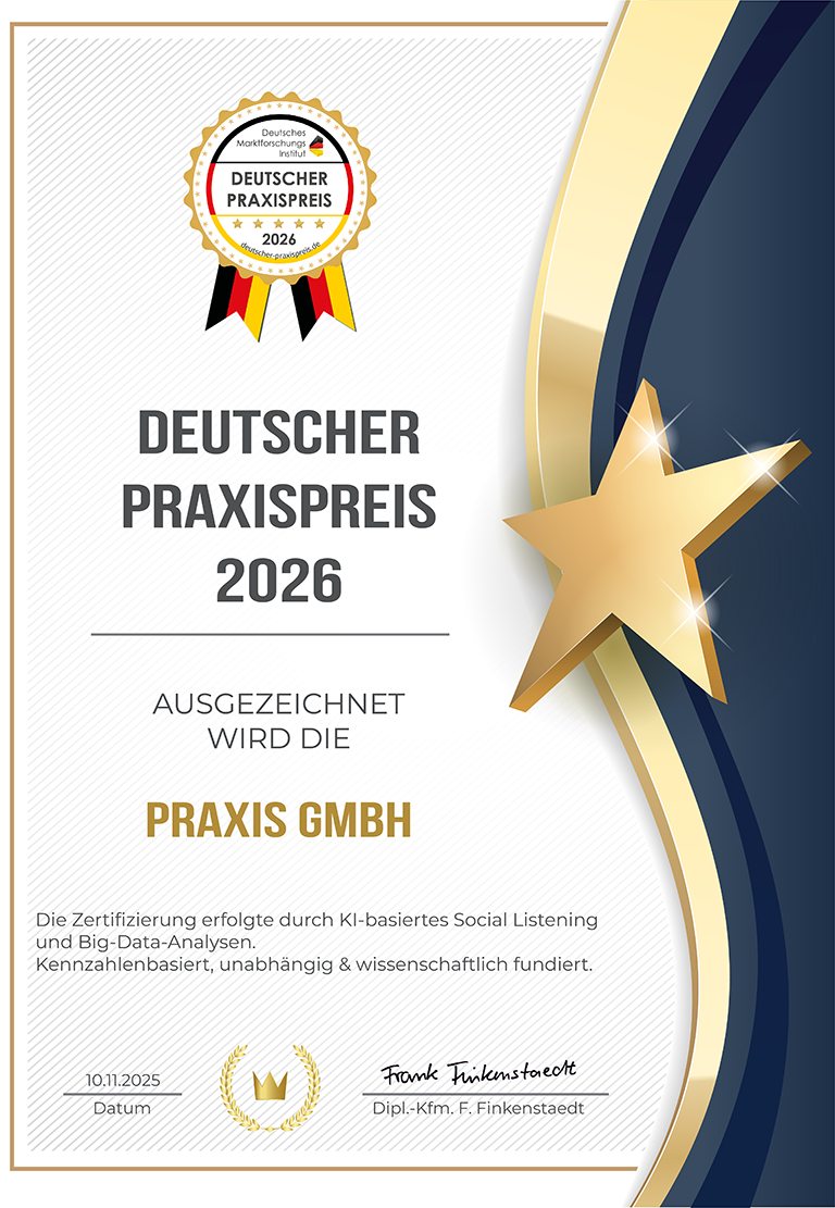 Der „Deutsche Praxispreis“ ist ein hochwertiges Qualitätssiegel, das ausschließlich an Praxen verliehen wird, die in allen Bereichen herausragende Leistungen erbringen. Es steht für höchste Standards. Dieses Siegel symbolisiert nicht nur eine Auszeichnung, sondern auch das Vertrauen der Kunden in ein außergewöhnliches Erlebnis.